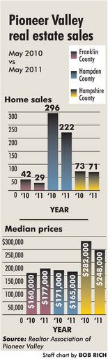 The median sales price of a home sold in the Hampden, Hampshire and Franklin counties fell by 0.05 percent from $180,000 in May 2010 to $179,900 in May 2011.